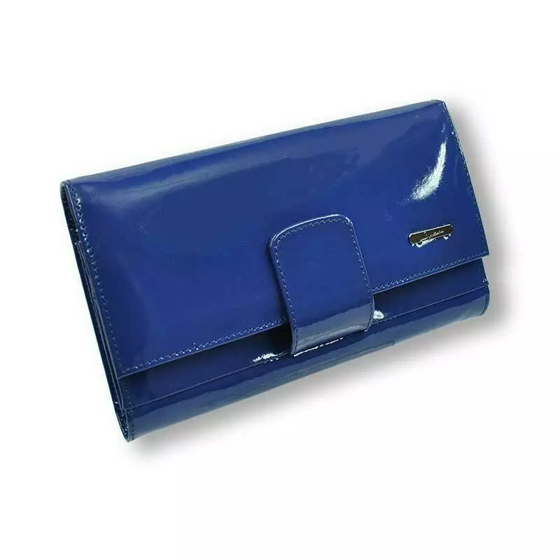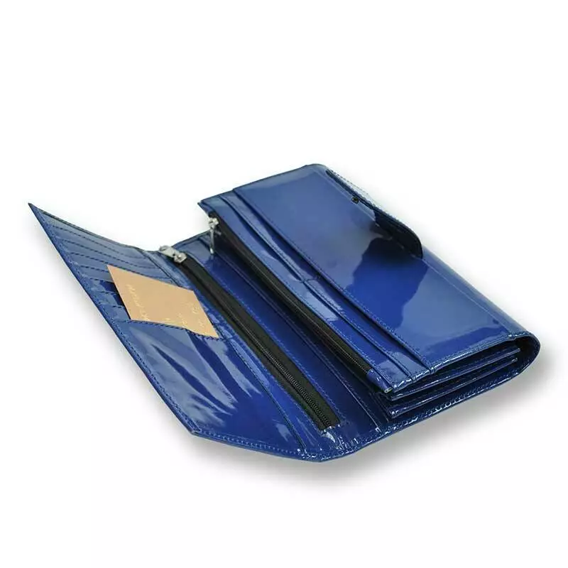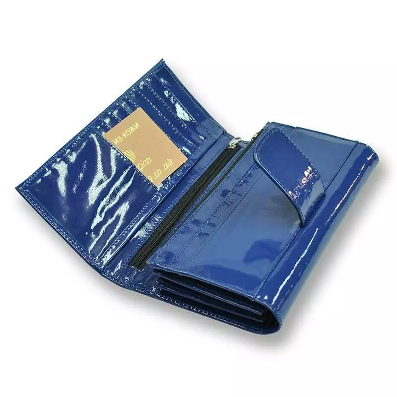 Жіночий гаманець пошитий із натуральної лакованої шкіри синього кольору.