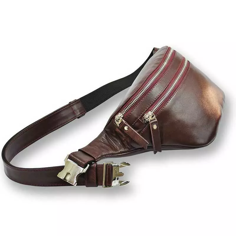 Шкіряна жіноча сумка на пояс пошита з натуральної шкіри наппа бордового кольору .